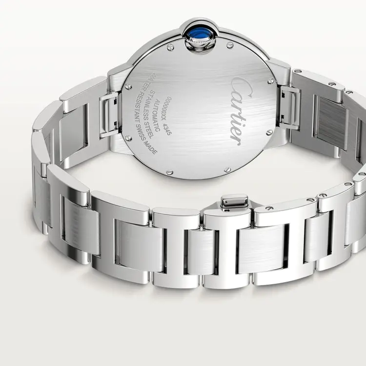 DetailBallon Bleu de Cartier watch, 42 mm, Manufacture mechanical movement with automatic winding, caliber 1847 MC. Steel case, fluted crown set with a synthetic cabochon-shaped spinel, blue sunray-brushed dial, silvered sword-shaped hands, sapphire crystal, interchangeable steel bracelet, calendar aperture at 3 o'clock. Thickness: 12.4 mm. Water-resistant up to 3 bar (approx. 30 meters/100 feet).  Case