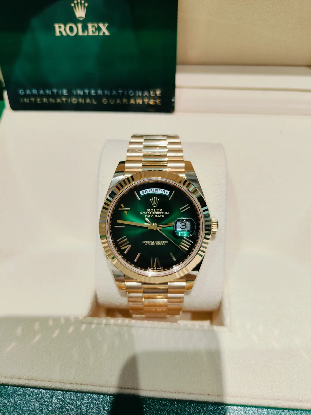 DetailRolex Online Shop Anniversary! All Rolex watches in our store have been sold at a discount well below their original price. Each model is limited to 30 pieces, and the original price will be restored immediately after they are sold out.  Take home the watch youβve always wanted. The best investment now is to invest in yourself. Choose the right watch to give off your masculine charm.  Fluted bezelThe Rolex fluted bezel is a mark of distinction. Originally, the fluting of the Oyster bezel had a functional purpose: it served to screw the bezel onto the case helping to ensure the waterproofness of the watch. It was therefore identical to the fluting on the case back, which was also screwed onto the case for waterproofness, using specific Rolex tools. Over time, the fluting became an aesthetic element, a genuine Rolex signature feature. Today the fluted bezel is a mark of distinction, in gold on this Day-Date 40.  Green ombrΓ© dialThe ombrΓ© dial features a coloured surface at the centre, progresses to a deep black around the edge. This dial represents the continuity of a design that Rolex introduced in the 1980s and relaunched in 2019. The manufacture of these dials with a concentric gradient involves the application of black lacquer, a delicate operation overseen by a specialist whose task it is to ensure the harmonious transition from colour to darkness.  18 ct yellow goldBy operating its own exclusive foundry, Rolex has the unrivalled ability to cast the highest quality 18 ct gold alloys. According to the proportion of silver, copper, platinum or palladium added, different types of 18 ct gold are obtained: yellow, pink or white. They are made with only the purest metals and meticulously inspected in an in-house laboratory with state-of-the-art equipment, before the gold is formed and shaped with the same painstaking attention to quality. Rolex's commitment to excellence begins at the source.