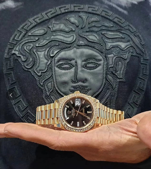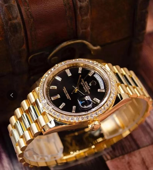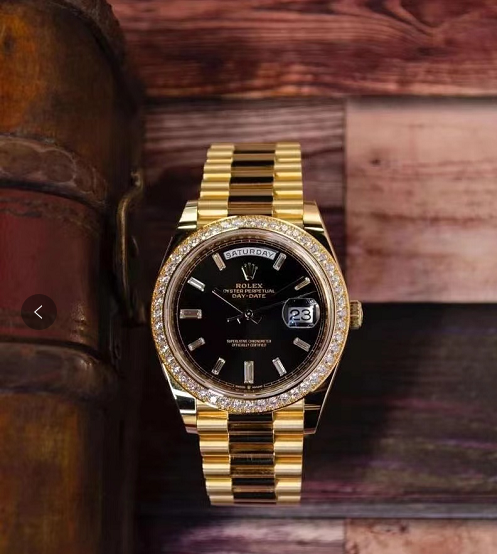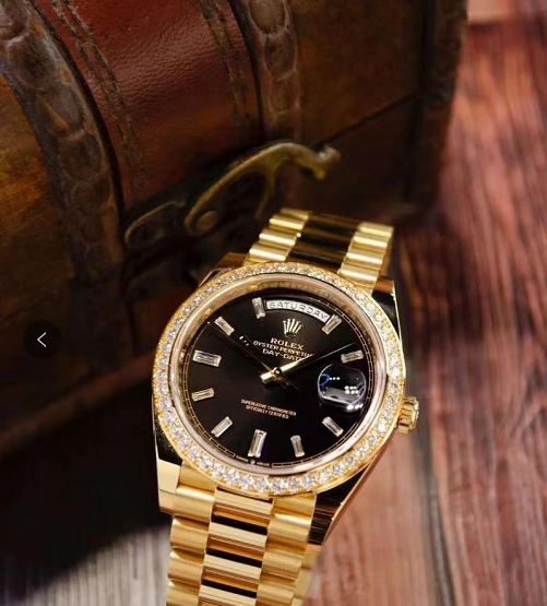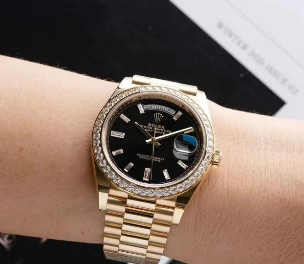 This piece comes complete with box and certificate of authenticity.Rolex Perpetual Day-Date 40 Watch of 18k Yellow Gold with diamonds. Black dial set with diamonds hour markers. The 18k Yellow Gold set with diamonds bezel. The President bracelet of 18k Yellow Gold, 228348rbr-0001. Rolex Perpetual Day-Date 40 Watch of 18k Yellow Gold with diamonds Black dial set with diamonds with hour markers of 10 baguette-cut diamonds. Screw-down, Twinlock double waterproofness system. Scratch-resistant sapphire crystal, Cyclops lens over the date. Centre hour, minute, and seconds hands Instantaneous day and date in apertures, unrestricted rapid-setting. Stop-seconds for precise time setting. The bezel of 18k Yellow Gold set with 48 diamonds. The Watch comes with Mechanical Self-winding Movement & 3255 Caliber w/ 31 jewels & 70 hours power reserve. The President 18k Yellow Gold bracelet with concealed folding Crownclasp. The Watch is with a Rolex Watch box, Rolex Warranty Card. Covered with Rolex Warranty. SPECIFICATIONS: Make Rolex Model Day-Date 40 Reference 228348rbr-0001 MODEL CASE Model case Oyster, 40 mm, yellow gold, and diamonds Oyster architecture Monobloc middle case, screw-down case back, and winding crown Diameter 40 mm Material 18 ct yellow gold Bezel Set with diamonds Winding crown Screw-down, Triplock triple waterproofness system Crystal Scratch-resistant sapphire, Cyclops lens over the date Water-resistance Waterproof to 100 meters / 330 feet MOVEMENT Movement Perpetual, mechanical, self-winding Caliber 3255, Manufacture Rolex Precision -2/+2 sec/day, after casing Functions Centre hour, minute and seconds hands Instantaneous day and date in apertures, unrestricted rapid-setting. Stop-seconds for precise time setting Oscillator Paramagnetic blue Parachrom hairspring. High-performance Paraflex shock absorbers Winding Bidirectional self-winding via Perpetual rotor Power reserve Approximately 70 hours BRACELET Bracelet President, semi-circular three-piece links Bracelet material 18 ct yellow gold Clasp Concealed folding Crownclasp DIAL Dial Black set with diamonds Gem Setting 10 baguette-cut diamonds CERTIFICATION Superlative Chronometer (COSC + Rolex certification after casing) WHAT IS INCLUDED Box Original Rolex Watch box Booklets Yes Warranty Rolex Warranty card