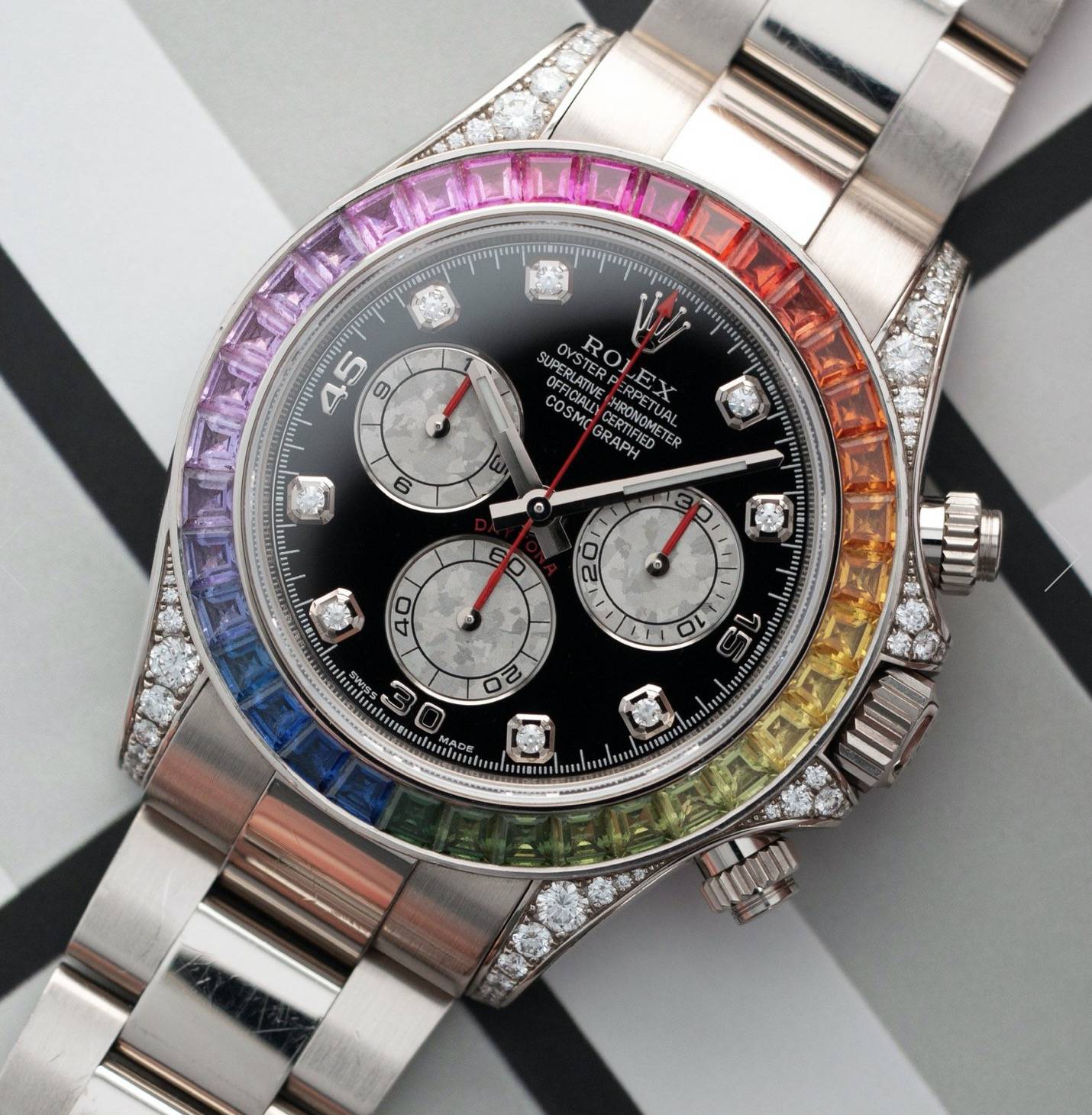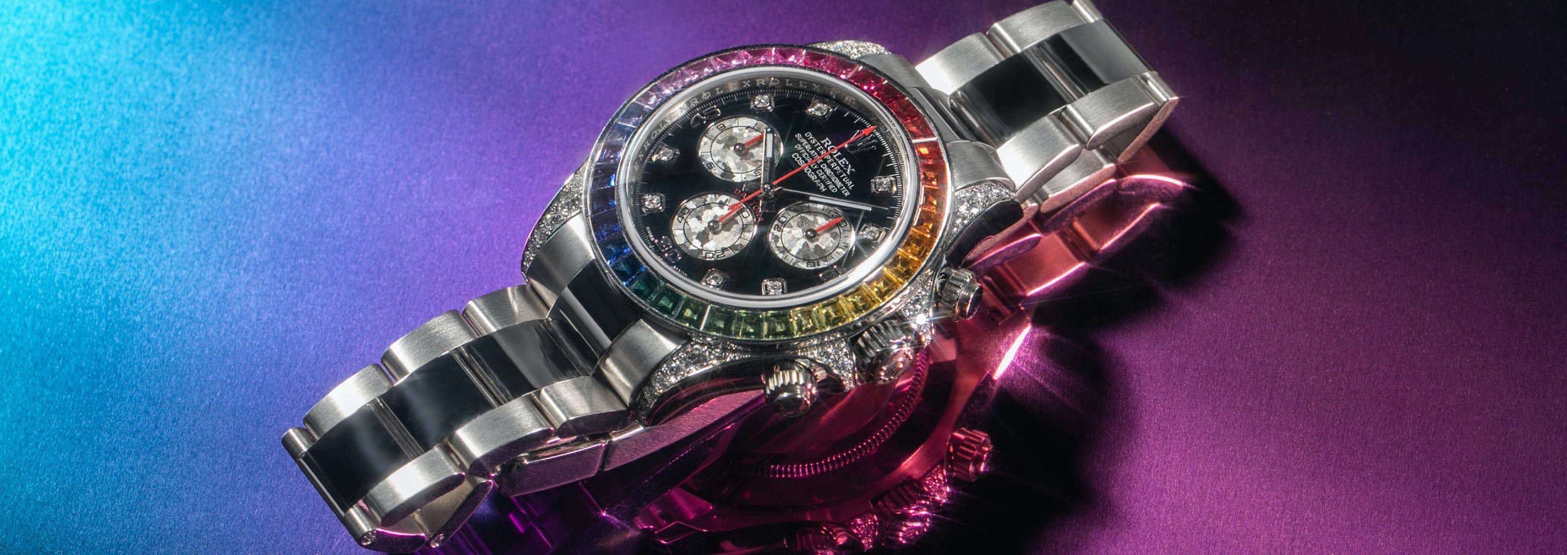 >>What you see is what you getA bold and colorful statement in luxury timepieces, the Rolex Rainbow Cosmograph Daytona is a highly sought after wristwatch.  Rolex accepts nothing but the best, and because of this, the gemstones needed to create the Rainbow are scarce.  Itβs no surprise that a Rainbow Daytona is a watch many collectors consider a grail watch.  Rolex Daytona Cosmograph (116599RBOW) self-winding automatic watch, features a 40mm 18k white gold case with a raindbow sapphire bezel with diamond lugs surrounding a diamond dial on an 18k white gold Oyster bracelet with folding buckle.  CASE & DIALCase Size: 40mmCase Material: White goldDial Color: BlackHours Markers: DiamondCaseback: SolidCase Shape: RoundWater Resistance: 100mFUNCTIONMovement: AutomaticSTRAP/BRACELETStrap/Bracelet Material: White goldBand Color: SilverBuckle Type: Folding buckleBracelet Length: 7.75" CASE & DIALCase Size: 40mmCase Material: White goldDial Color: BlackHours Markers: DiamondCaseback: SolidCase Shape: RoundWater Resistance: 100mFUNCTIONMovement: AutomaticSTRAP/BRACELETStrap/Bracelet Material: White goldBand Color: SilverBuckle Type: Folding buckleBracelet Length: 7.75"  Why choose us? - We work directly with manufacturers around the world to ensure the best quality of our products . We have a quality control department to help us keep our promises!